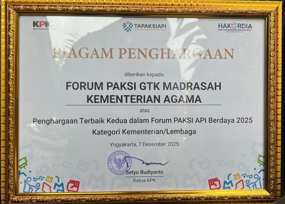 Penghargaan kedua diraih oleh Forum Penyuluh Antikorupsi (PAKSI) Guru dan Tenaga Kependidikan (GTK) Madrasah Kemenag, yang dinobatkan sebagai Terbaik Kedua Nasional dalam Forum PAKSI–API Berdaya kategori Kementerian/Lembaga. Penghargaan ini diberikan atas kiprah GTK Madrasah dalam penyuluhan integritas dan pendidikan antikorupsi di sektor pendidikan.